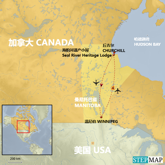 今天乘飞机抵达丘吉尔后,我们的专业工作人员将在机场迎接您,并为您提供转接内陆小飞机服务。您的探险之旅将从空中俯瞰蜿蜒曲折的哈德逊湾开始,途中您将前往未来六天的家 — 海豹河遗产小屋(Seal River Heritage Lodge)。